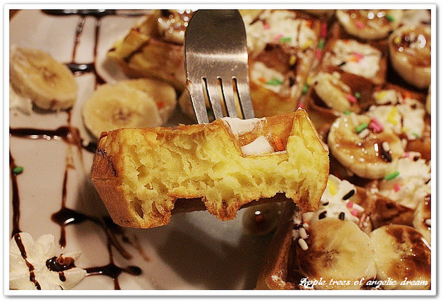 一開始看到格子狀的紋路配上香蕉奶油及巧克力,整體擺盤拍起來很繽紛的感覺