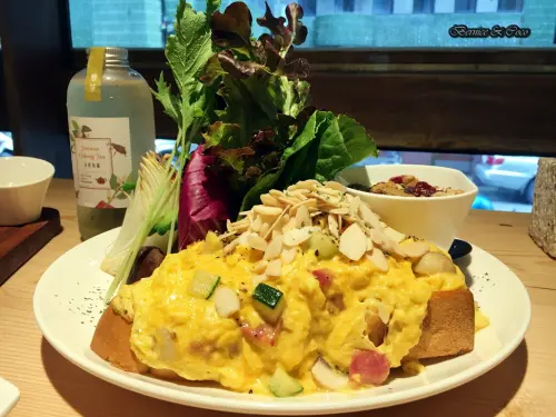 鳳梨還帶皮,洋蔥也是1/5顆大小,這麼高聳就像早午餐中的森林,我是不是有能力可以吃完我都很懷疑,最後這份當然有挑戰成功囉