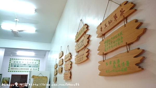 店內牆上有幾幅關於仙草的木頭掛飾。