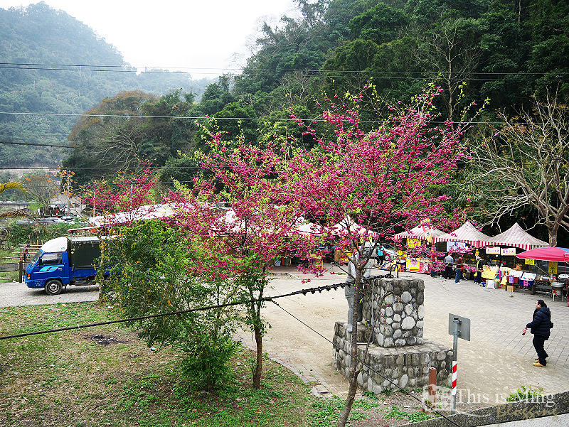 吊橋旁的小廣場邊擠滿了小販,我們去的時候山櫻正放。