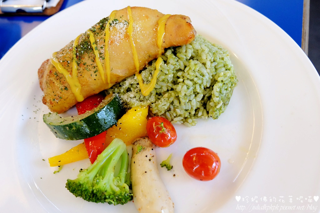 鄉村菠菜雞腿捲飯,雞腿鼓鼓的因為裏頭有包菜,看起來蠻好吃的