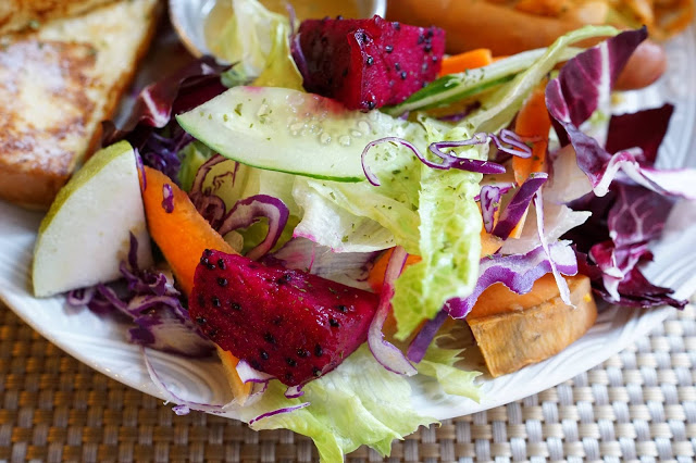 ▲生菜的部份有蘿蔓、小黃瓜、芭樂、胡蘿蔔、地瓜、紫高麗菜、火龍果,含大量的纖維質,有的清脆、有的清甜,是一道很健康的食物。