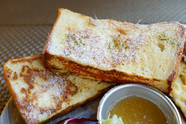 ▲吐司沾上蛋液,放在平底鍋煎烤,完成之後再灑一點白糖粉,就是所謂的法式吐司,既簡單又美味的一道料理,這一家給的厚片吐司感覺比一般的大一點,而且煎的恰到好處不油膩,吐司均衡地吸收了蛋液,每一口吃起來都很香,還有一個比較特別的地方,就是吐司的中間夾了一片起司,讓口感更加香濃。