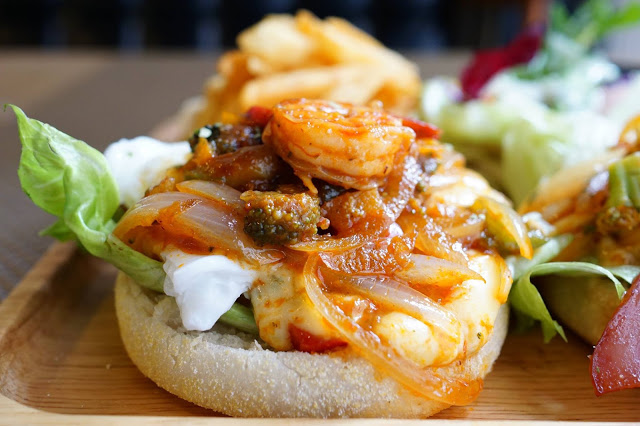 ▲將「蝦仁、洋蔥、花椰菜、紅椒、黃椒」和辣醬炒過之後,放在疊好的「英式瑪芬、生菜、火腿、水波蛋」上面之後,「辣蟹蝦仁班尼迪克」就完成了。