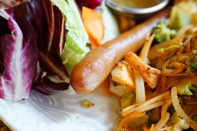 ▲除了生菜之外,還有這一道開胃炒蔬食,用「杏鲍菇、洋蔥、花椰菜、紅椒」與辣醬一起炒,雖然看起來紅紅的,不過吃起來不會很辣,而是微辣爽感,很有刺激食慾的效果。