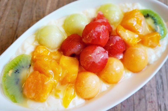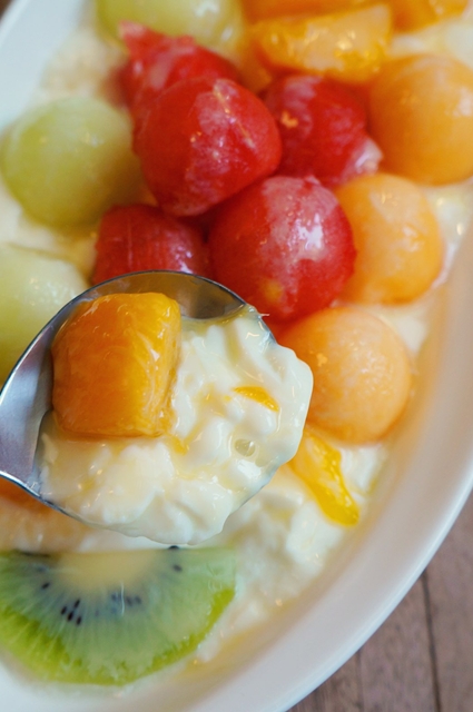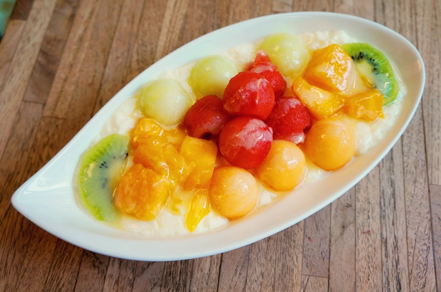 而且瓜類都像冰淇淋一樣挖成球狀,下面墊著滿滿的燉奶,讓客人可以一口燉奶一口水果,