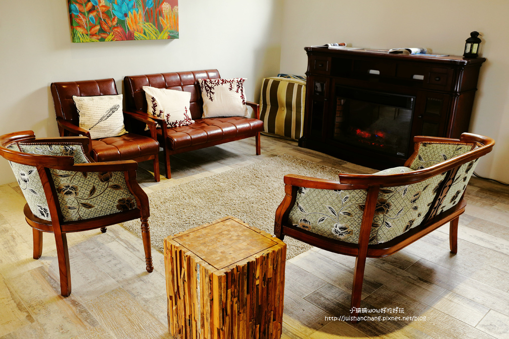 民宿一樓挑高寬敞的接待大廳美式鄉村風格,木製家具佈置,讓人感覺超溫馨的