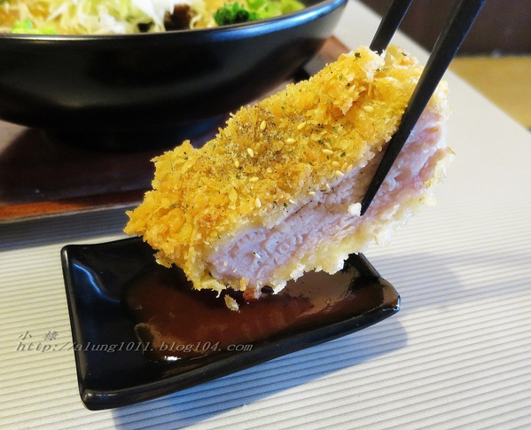 ◎外皮香酥的厚切豬排很有份量,斜切剖面就有3-4公分厚…