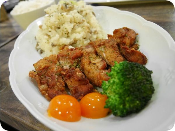 另外朋友點的是燉飯佐香草雞排,外皮也是炸的非常酥脆,但雖然是炸的,卻完全不油膩,