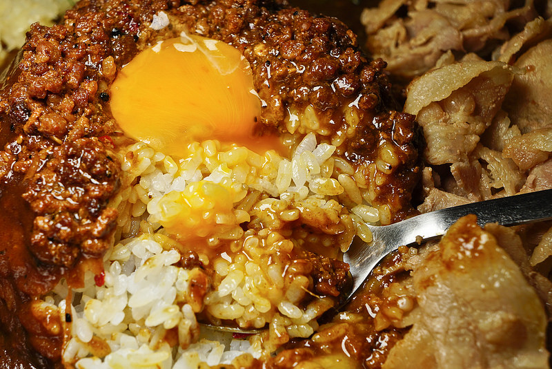 那照慣例一定要拍一下蛋黃流出來, 弄破後其實就是把它和咖哩與肉燥拌在一起最好吃