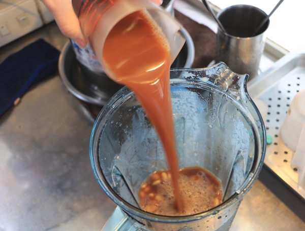 黃豆每日經過洗浸、挑豆、浸泡、挑皮、熬煮1.5小時後,再將煮好的黃豆加上適當的水量由調理機現打,每一杯都是當天現打、完美比例呈現。