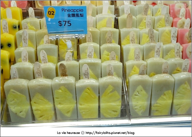 使用來自日本的草莓,顏色經冰鎮之後,仍舊是呈現出一樣嬌豔的紅,本身帶點微酸,與甜度較高的芭樂冰棒倒是個很合拍的組合,而金鑽鳳梨是配著日本無花果汁,基本上無花果沒有太鮮明的滋味,幾乎都鳳梨最為搶風頭呦!