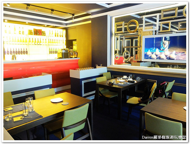 寶藍色為主色調,紅色吧檯在餐廳裡頭顯得特別凸出,感覺有spotlight聚焦變成視覺亮點