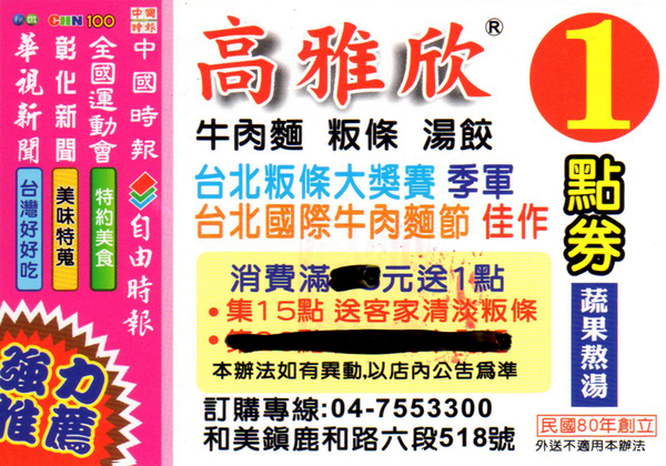 高雅欣牛肉麵粄條湯餃專賣店位於彰化和美國小附近,從民國八十年開張至今已近廿五年。老街上,不仔細的看,很難察覺這隱身在店面之間的精緻木門。