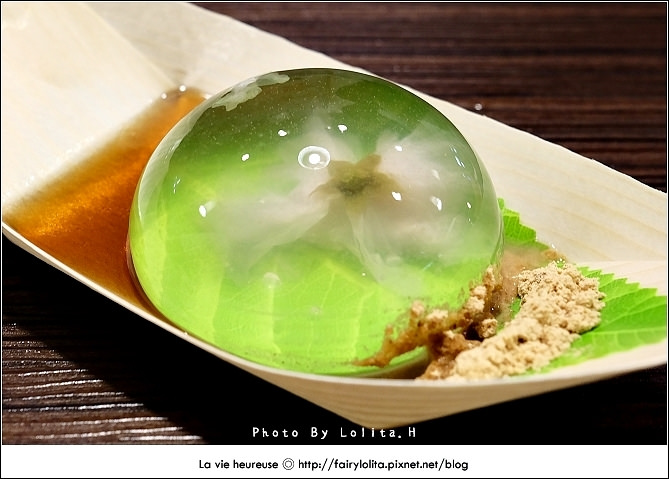 使用日本進口的海藻萃取植物膠質,搭配黃豆粉及沖繩黑糖蜜,水信玄餅本身沒有什麼味道,都是旁邊的佐醬帶出甜味,吃來其實跟果凍很像,而櫻花本身有一點甜甜的滋味,外型就像是個水滴蛋糕,能給人甜蜜的幸福感呢!