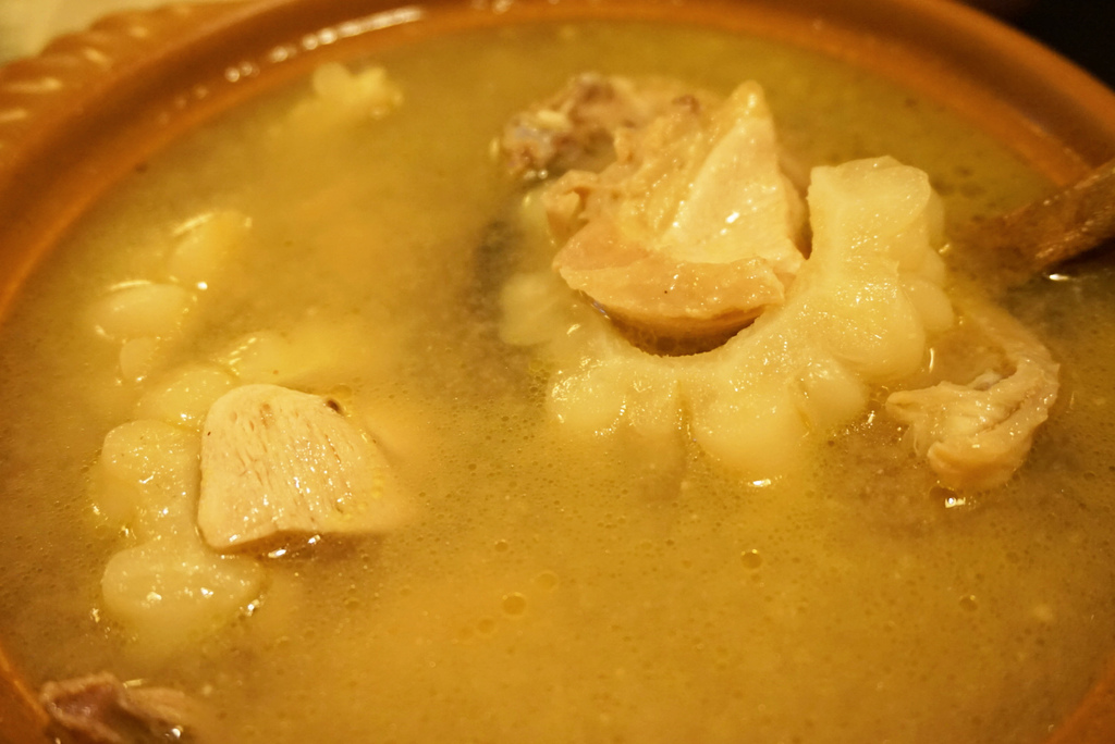 下面是放雞湯的陶器,沒有提供瓦斯爐或燭火保溫,感覺沒有特別的作用,但若要移動雞湯的話可以扶著。