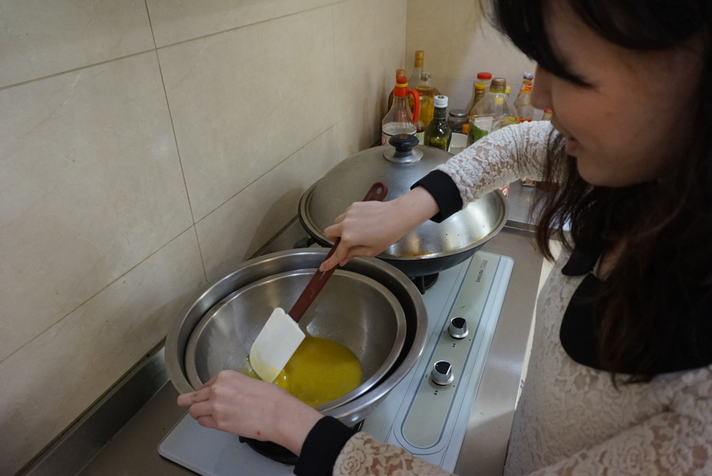 1. 放入安佳奶油110g+細砂糖120g 並隔水加熱。
