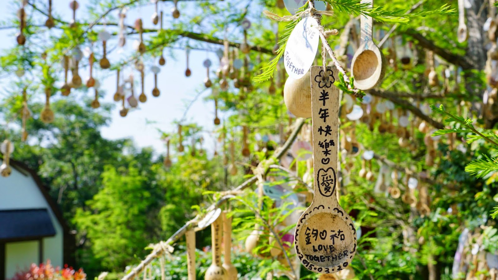 ▲外圍是「情定之牆」,購買來的木質湯匙,可以寫上留言掛在牆上或樹上做為紀念。