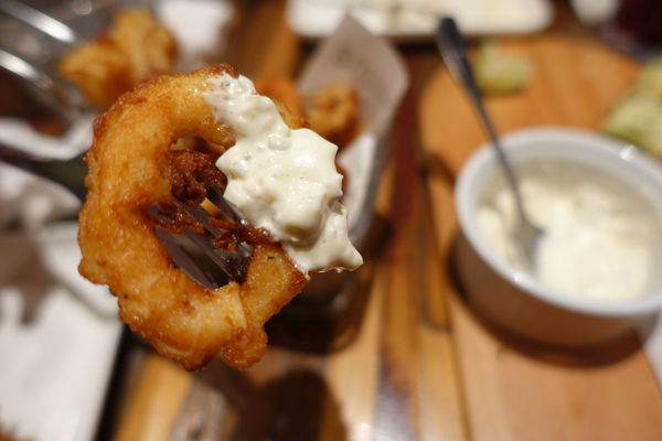使用啤酒麵糊裹成的外衣,油炸後金黃酥脆到不行,