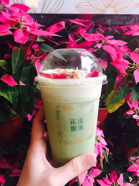 花漾招牌映襯在綠葉中,因為她飲料中就撒了可食用的花瓣喔