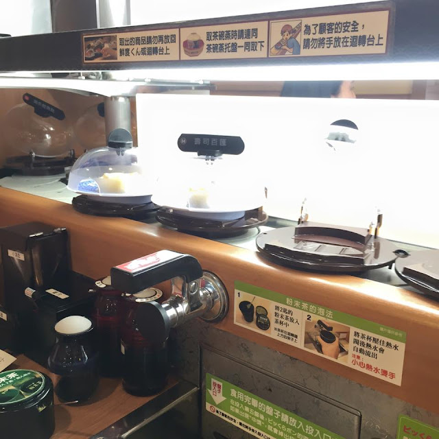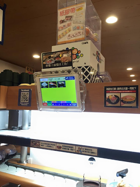 坐下後,看到什麼想吃的迴轉壽司就伸手拿吧,不過只是拿盤子,拿得時候要稍微往上抬一下,不是連蓋子都拿走歐。如果迴轉台上都沒有看到自己想吃的,也可以利用座位上的點餐幾點餐,手指頭按一按,餐點很快就送過來了!