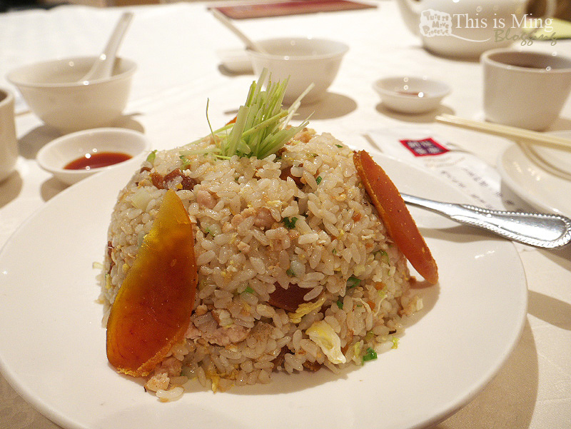 主餐部分我們點了一品烏魚子炒飯(NT.320),炒得金黃的炒飯外頭貼了三片烏魚子,上頭插滿了嫩綠的小蔥苗,視覺上看起來很別緻,可是心裡不免嘟嚷著就加三片烏魚子的炒飯要賣300多喔?