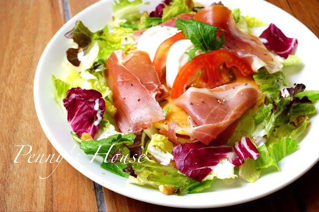利用大量生菜,加上西班牙火腿還有新鮮的莫札瑞拉起司,整體口感清爽又健康,