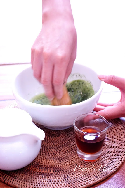 這是自己可以DIY的抹茶,先將熱水倒入,再用茶刷快速攪拌,等抹茶有一層泡沫就完成。