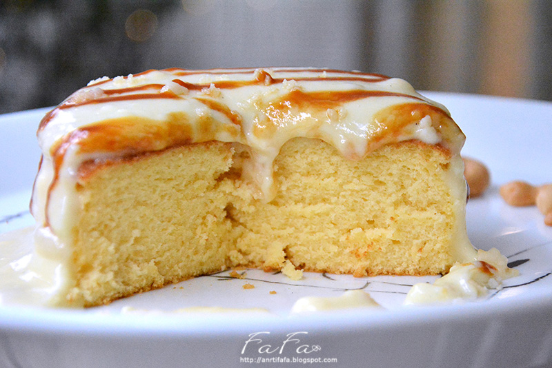 將焦糖醬淋在上頭呈現條紋狀,旁邊垂涎欲滴模樣其實蠻可愛的,