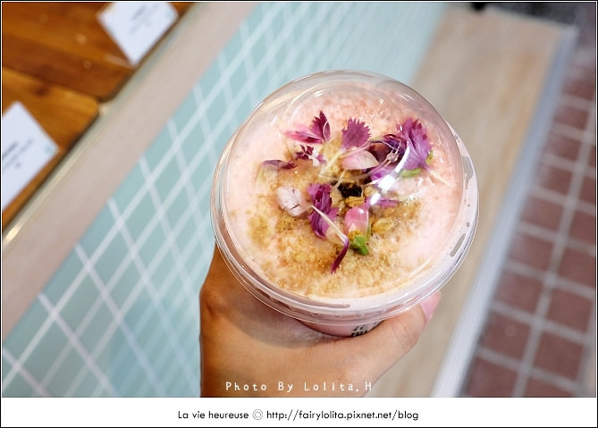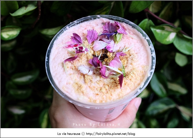 耶耶~果汁終於拿到手了!粉粉嫩嫩、又加了花瓣的長相也太美了吧!你相信嗎?它只是一杯西瓜汁耶!如果舉辦一場飲料選美大賽,那麼冠軍肯定非它莫屬XD