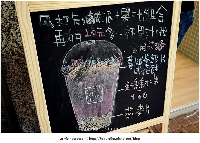 目前新開幕有優惠活動,只要購買鹹派+果汁組合,再打卡就可以用10元再加購果汁一杯,整個划算到不像話,不打根本對不起自己XD