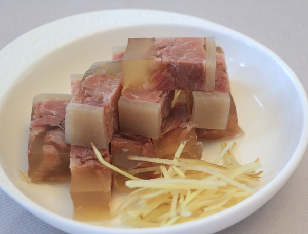 嚴選豬皮,再切掉多餘的油質煮出一整鍋膠質,避免夾取食用時不會散開,且增加口感的加上豬肉塊,放入模具裡,反覆加上膠質與豬肉塊,冰涼後成半透明狀,吃起來冰冰的,十分爽口,是最貨真價實的膠原蛋白喔!!