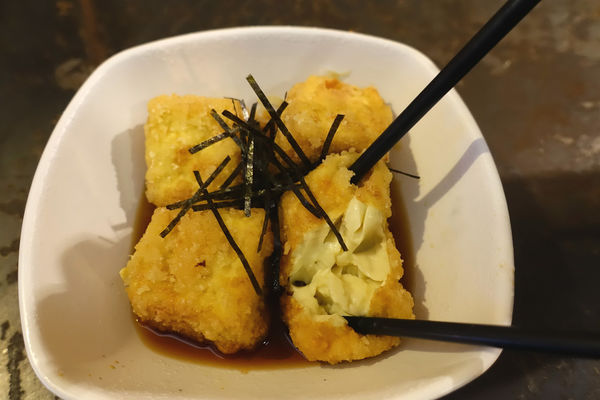 和台式偏厚稍硬的臭豆腐外衣不同,店家的日式作法讓豆腐外衣很特別~
