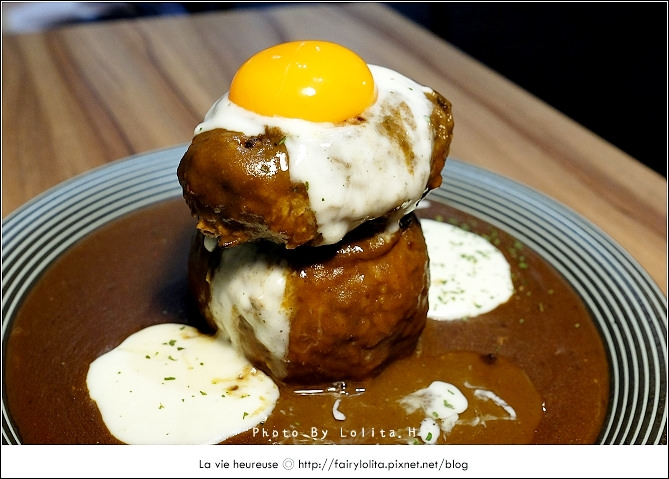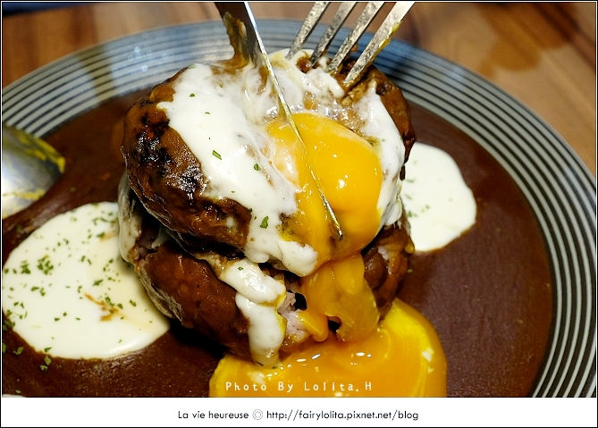 疊疊樂的漢堡排看起來真的好迷人,剛端上桌時就能聞到它那濃濃的咖哩香氣,尤其那黃澄的生蛋根本超犯規,我跟同事不約而同都驚呼了一聲,實在是這美食太正點啦!