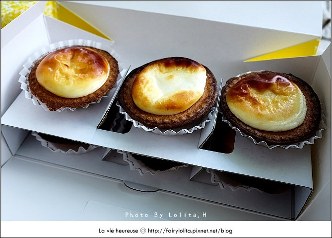 一回家,立馬拿出相機拍照,盒裝起司塔分成上、下兩層,中間是淡淡的米黃色,而外層則帶了一圈焦褐,含蓄的~可以聞到它那散發出來的起司香氣。