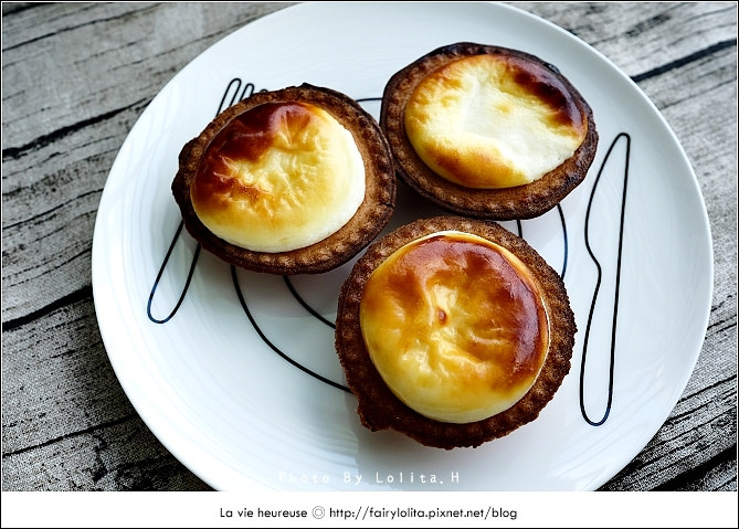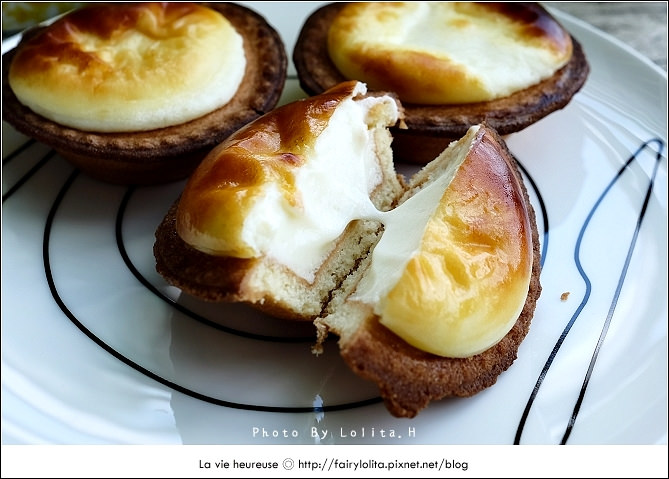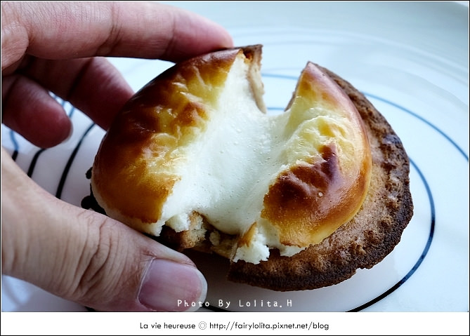 本來以為在常溫下的內餡會是比較接近凝固狀,沒想到一切開,卻是讓人驚喜的半融化狀態,滑順細緻、是一種介於蛋糕與慕司之間的綿密口感,一入口很明顯可以感覺到起司鮮明的鹹味,好喜歡它超級酥脆的塔皮~就好像在吃餅乾一樣,但吃到底部時,卻像是在品嚐著雞蛋糕,這樣漸層式表現,實在讓人好驚豔呦!
