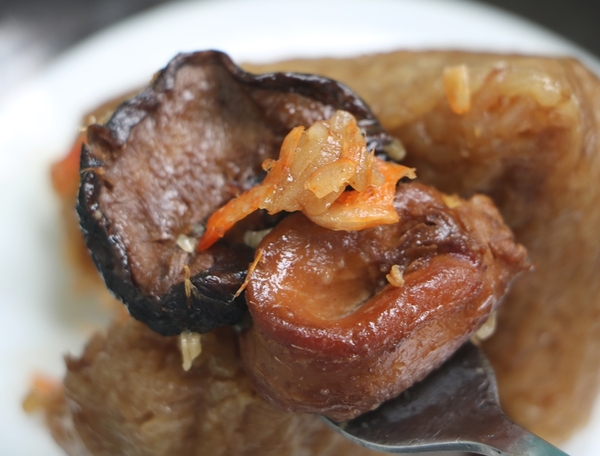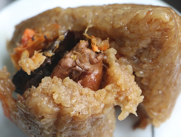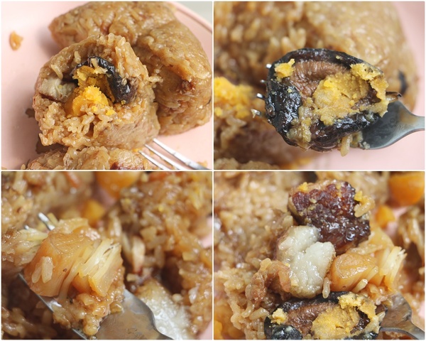 肉粽內餡料多又實在的,除了有蝦米、金黃蛋黃,還有魯的香氣四溢的香菇包在裡面,不是切片,而是一整朵大朵香菇,搭配比較軟Q的米飯,咬起來特別紮實有嚼勁。另外還有來自日本一整顆的干貝,搭配我愛吃油滋滋的五花腩肉,吃肉粽就是要有肥肉才好吃啊,肥而不膩的口感,讓整個肉粽更美味了!!