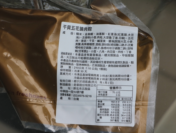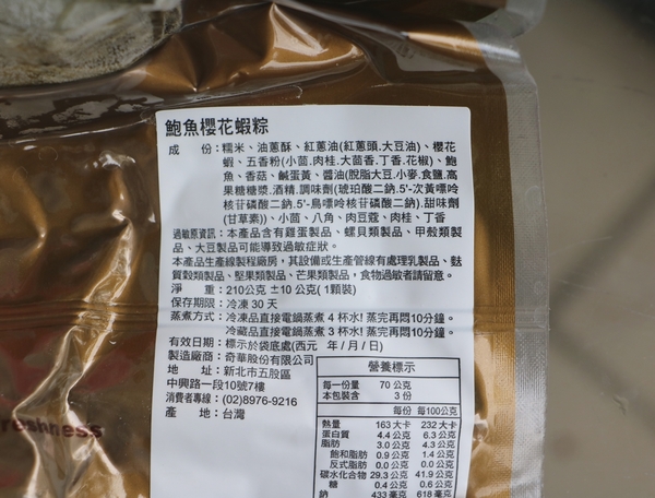 每一顆肉粽都有成份說明、過敏原資訊、淨重、保存日期、蒸煮方式與有效日期。最特別的是過敏原資訊,很少有食材會這樣特別註明的。畢竟加了不少海鮮類食品,海鮮易過敏的朋友可要斟酌啊!!