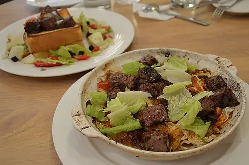 骰子牛烤厚片三明治,上層的菲力肉塊間有顆水波蛋,端上來就看見水波蛋ㄉㄨㄞㄉㄨㄞ感覺好古溜,二片厚片吐司堆疊,外圍還妝點了一圈鮮果生菜沙拉,整體配色看起來可口誘人.