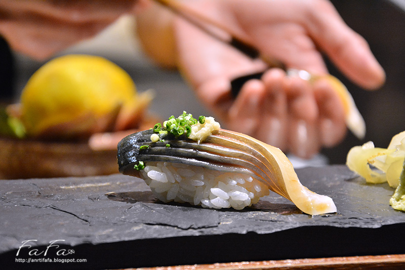青花魚握壽司,最後呈現效果十分的美麗,多層次重疊以及漸層色彩讓我們都驚艷了,