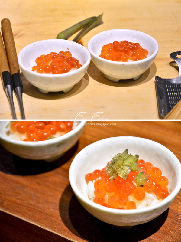 生筋子握壽司,師傅很神祕得將山葵上方的根切段後與鮭魚卵做搭配,