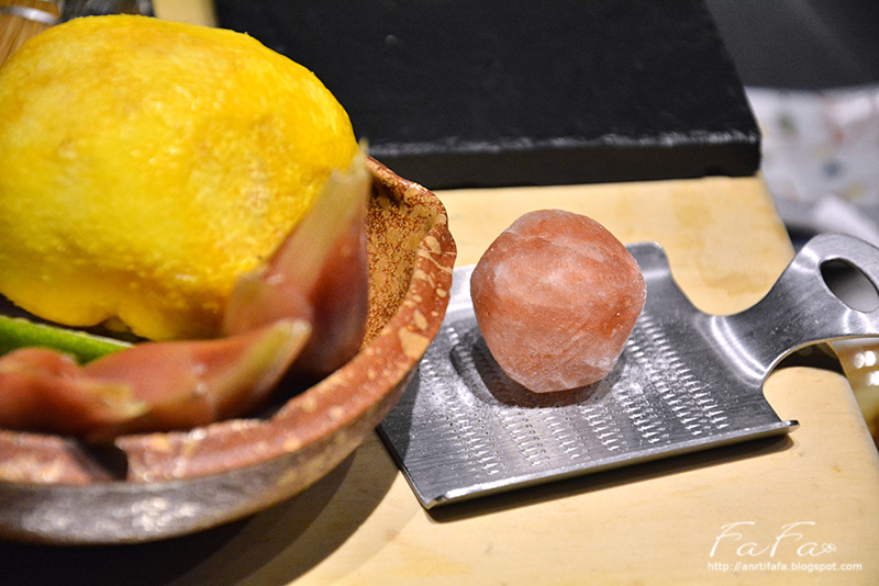 板岩餐盤上放置的是醃蘿蔔及薑片,醃蘿蔔有淡淡的柚子香氣,清脆多汁。