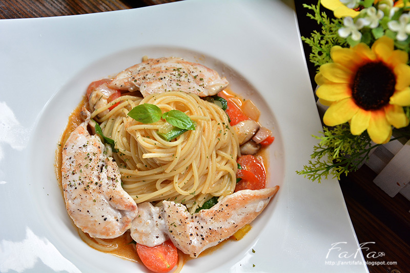 店員推薦的越南酸辣雞柳義大利麵,外觀酸辣程度看起來蠻無害的,