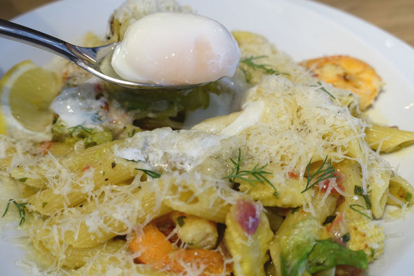 示意圖如下,看那黃澄澄的蛋汁流出到整盤義大利麵裡,充滿震撼感