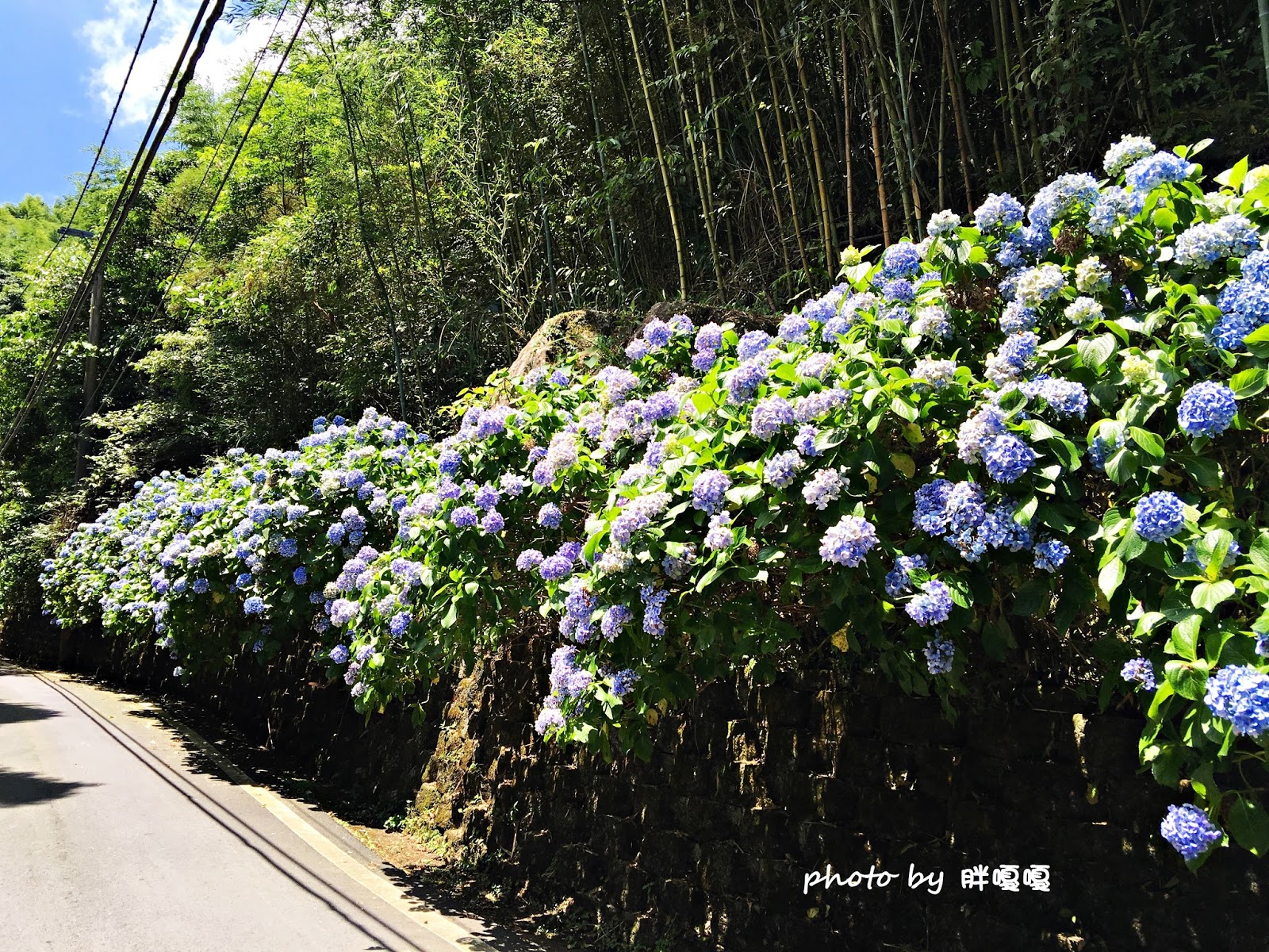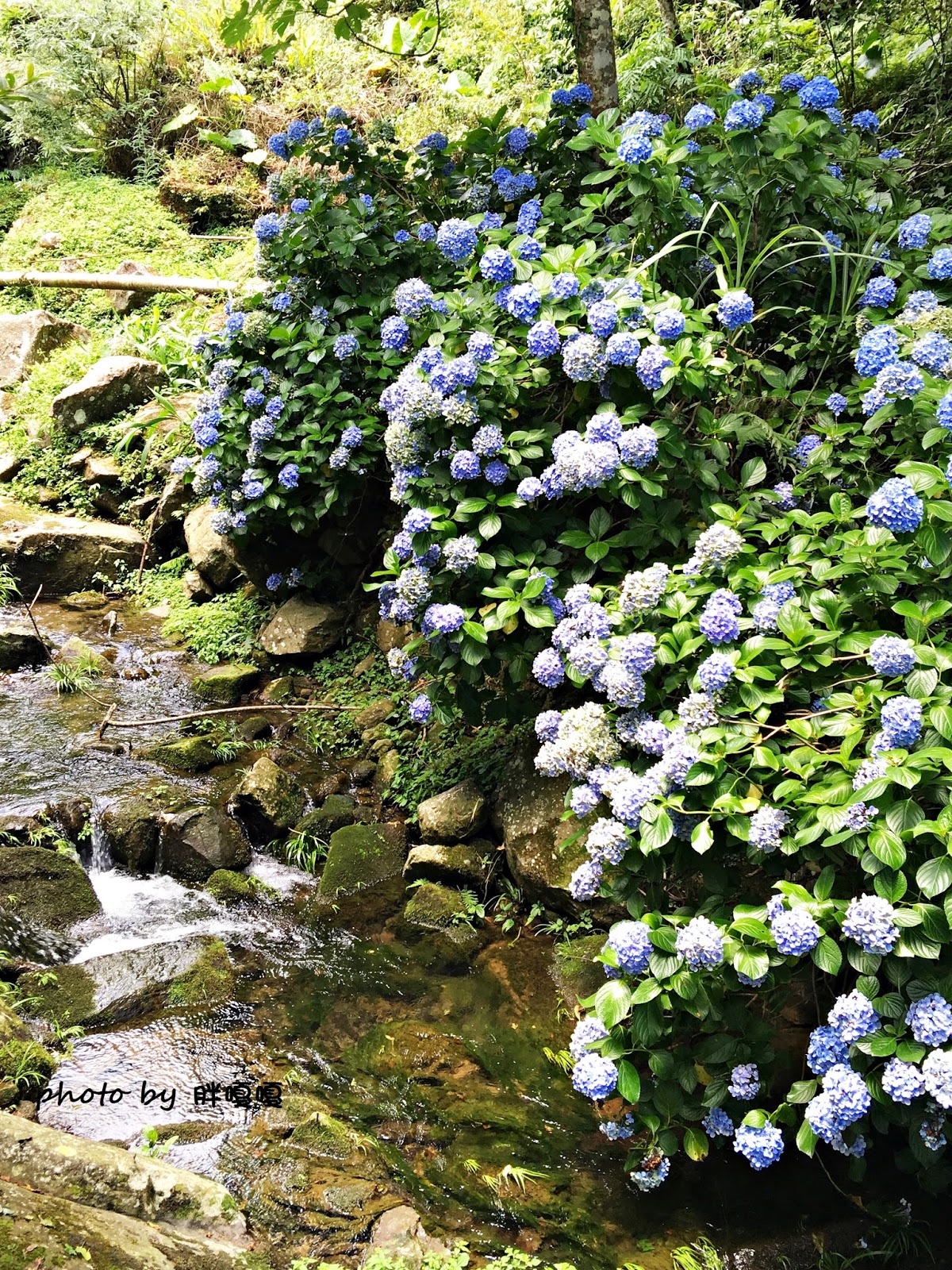 潺潺流水配上這滿開的繡球花