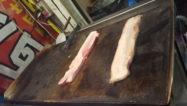 看到炙熱的鐵板上, 發出像下雨一樣稀哩花啦 的聲音,