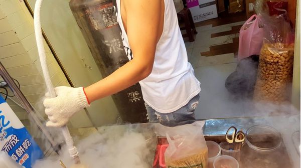 步驟二: 老闆接著會把氮氣液化酸素填充進去裝滿餅乾的塑膠杯中 !