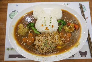 至於餐點的部分,我點了「漢堡排咖哩」,小敦點了「豬排咖哩」,既然是主題餐廳,餐盤上一定要有傑琪的倩影才行,店家果不其然端出傑琪臉型的白飯,看到這飯...就算沒有咖哩醬配,也夠我好好品嚐一番了,味道的話...因為傑琪造型的飯,讓我每一口都是戀愛的滋味...甜...蜜...蜜...>///< 以上是我不負責任的品嚐心得(逃)。