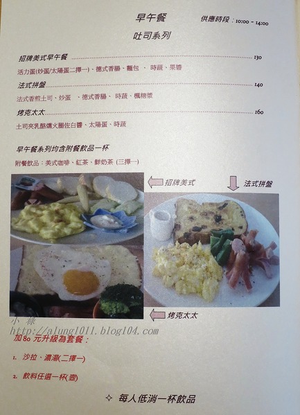 點早午餐系列附飲品:美式咖啡、鮮奶茶、紅茶三選1/+$80升級為套餐很划算有