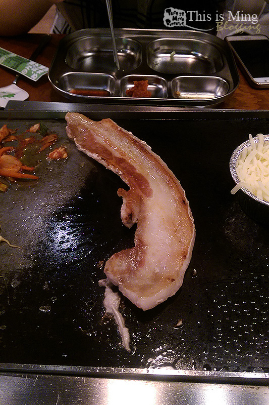 我手比較大,所以我一次抓兩片生菜平放在手掌上,將起司、泡菜、剛烤好的五花肉、辣味噌放進去,菜葉包起便可以大口享用。生菜葉超新鮮的,有夠清爽脆口,生菜葉裡的水分一咬開彷彿在口中流淌,即使五花肉有肉肥,但卻不覺得膩。